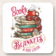 A fun and cheerful Christmas holiday design showcases a stack of books topped with a pair of glasses, a red and green scarf, and a cup of hot cocoa with whipped cream. Surrounding the books are holly leaves, candles, and stars. The colorful text reads: "Books, blankets, and hot cocoa." This design is available on a variety of products, making it a perfect gift for book lovers.