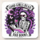 Un diseño colorido y vibrante muestra a una esqueleto femenina leyendo un libro mientras toma un cóctel al vapor. A su alrededor hay flores moradas y mariposas, que se suman a la estética animada. El texto audaz y colorido dice: "Los buenos chicas leen libros malos". Este diseño único está disponible en una amplia gama de productos.