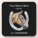 Una foto de una cabeza de caballo de la castaña dentro de una herradura en un fondo negro adaptable, con el texto puesto para un herrador como regalo promocional o de la publicidad para los clientes. Fotografía y arte por ruralfrance.