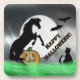 Diseño de fondo metálico gris con calabaza, murciélagos, la silueta negra de un caballo de cría y un gato. ¡Un gran regalo de Halloween para tu amante de los caballos!