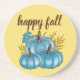 ¡Posavasos clásicos de calabazas azules de otoño! La tipografía de moda dice "feliz otoño". Tres calabazas azules lindas y coloridas con hojas de otoño. Fondo dorado de otoño. ¡Listo para tus bebidas favoritas!