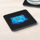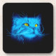 Una cara de gato azul fracturada con impresionantes ojos amarillos contra un fondo negro.