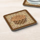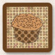 Cupcake with caramel frosting topped with chocolate sprinkles, in a decorative, chocolate brown and tan, polka dot cupcake wrapper, on a light brown and beige batik patterned background coaster