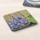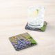 Una cesta de alambre de ciruelas moradas con hojas verdes.