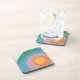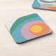 Ilustracion abstracto de círculos de color retro en tonos azules, turquesa, violeta, amarillo y naranja sobre fondo gris