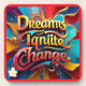 Un diseño vibrante con el texto "Los sueños incitan al cambio" en una deslumbrante gama de colores, acentuado con toques dorados que brillan como estrellas. La tipografía audaz está rodeada de formas abstractas y patrones giratorios que simbolizan la energía y el potencial de la creatividad. Este artículo inspira a los espectadores a aceptar sus aspiraciones y transformarlas en realidad."Imagen original generada por Meta AI. La IA generó obras de arte. Con licencia CC BY-SA 4.0.