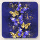 Composición de lujosas mariposas de zafiro y joyas de oro sobre fondo azul texturado.