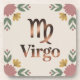 Esta montaña rusa muestra una imagen Virgo Zodiac con flores, el glifo Virgo y la palabra Virgo. El glifo Virgo y la palabra Virgo están en un color metálico de cobre en el centro. Hay flores rosas y amarillas con hojas verdes en las esquinas. La montaña rusa es una dura montaña de plástico con respaldo de corcho. El conjunto de la montaña rusa contiene seis tiras.