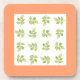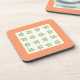 Un conjunto de bonitos de posavasos con respaldo de corcho o Maquetas de mesa, con un patrón delgado de rosebudos rosas sobre un fondo blanco, encerrado en un borde de albaricoque, de un diseño pintado a mano por Judy Adamson.