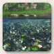 Escena submarina dividida con un valle verde por encima y las profundidades frías de un río montañoso rocoso por debajo. Los rayos solares bailan a través del agua y los bancos de peces plateados nadan entre las piedras y las malezas del lecho del río.