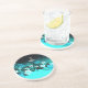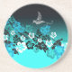 Aquí hay una explosión de flores tropicales en un fondo turquesa de desvanecimiento a negro. El diseño incluye un solo colibrí metálico estilizado.