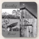 Disfruta de este collage de imágenes rústicas en blanco y negro: un tractor antiguo, una puerta de granero atada y un techo de paja. Imágenes marcadas con un fondo gris oscuro y las palabras "País" y "Hogar" en escritura negra en la esquina superior izquierda y en la esquina inferior izquierda.