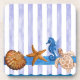 Diseño original pintado en acuarela por Sandra Gale, con estrellas de pescado, caballo de mar, tortuga y conchas sobre un fondo de rayas azules translúcidas verticales. Excelente diseño para el verano, casas de playa, bungalows o para todo aquel que ame la playa, el océano o el pescado.
