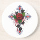 Cruz de plata con rosa roja y hojas negras sobre fondo blanco.