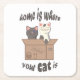 Dos gatos en una caja de artesanías y una graciosa cita "el hogar es donde está tu gato"