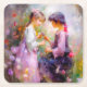 Un cuadro de dos chicas generado por IA en un jardín de flores. Perfecto para el arte en guardería.