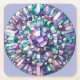 Esta montaña rusa presenta un diseño de mosaico con piedras preciosas fluoritas en un diseño circular. El diseño redondeado está sobre un fondo azul claro en una montaña. La imagen es muy estética con efectos de luz y brillo de las piedras preciosas. El diseño es un diseño de arte generativo. La montaña rusa es una montaña rusa de pasta de papel cuadrado. El conjunto de la montaña rusa contiene seis tiras.