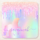 Un fondo iridiscente de moda con unicornio y colores pastel de arcoíris en rosa, púrpura, dorado rosa, verde menta. Decorado con gotas de brillo falsas en rosa dorado, rosa, púrpura y un unicornio de colores de arcoíris. Letras de color púrpura. Personaliza y agrega tu nombre escrito con un estilo de letra manuscrita moderna. Perfecto para una fiesta de cumpleaños, despedida de soltera o baby shower.