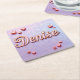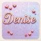 This coaster features a lavender gradient background. The name Denise is showcased in pink script with pink hearts and daisies. The letters in Denise are pink with a gold outline. The coaster is a square paper pulp coaster. The coaster set contains six coasters.