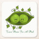 Una vaina verde rodeada de hojas verdes. Dentro de la vaina acurrucada juntos hay dos adorables guisantes con las caras más agradables. Debajo hay una plantilla de texto que dice Dos guisantes en un pod, que puede usar como está o cambiar a su propio texto.