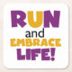 Si te gusta correr, correr 5 Ks, 10 Ks, media maratón, o maratones, te encantará este colorido diseño de texto en morado y amarillo que dice Correr y abrazar la vida! Corre y abraza camisetas de la vida, caramelos, imanes, botones, tarjetas, pegatinas, llaveros y muchos otros artículos para corredores que aman un diseño de ejecución brillante y colorido.