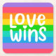 Esta obra de arte presenta un arcoiris colorido con las palabras Love Wins.