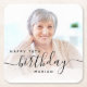 Modernas posadoras de papel para fiestas de cumpleaños con una foto personalizado. Reemplace fácilmente la imagen de muestra con una foto del invitado de honor. La palabra "cumpleaños" aparece en un elegante guión de escritura a mano en negro. Personalice el texto con el nombre y el año de cumpleaños en el tipo de letra sans serif negro. Una superposición de degradado blanco ayuda a hacer que el texto aparezca.