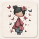 A paper coaster (sturdy pulp board) with an image of a young girl holding a butterfly wand. An adorable unique retro style doll with rosy cheeks. Butterflies flying all around. Sweet and cute.