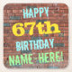 Este divertido diseño de montaña rusa con temática de cumpleaños muestra un mensaje como "FELIZ CUMPLEAÑOS 67, NOMBRE - AQUÍ!", donde el nombre puede ser personalizado. El fondo está representado por una pared de ladrillo de ladrillo marrón rojizo. El texto del mensaje de personalizable presenta colores como azul, amarillo y verde, y tiene un aspecto inspirado en el de los graffitis pintados. Las galletitas como estas pueden ser útiles como decoraciones prácticas en una fiesta de cumpleaños para alguien que está celebrando su sexagésimo séptimo cumpleaños. [~Z0000288]