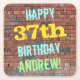 Este divertido diseño de montaña rusa con temática de cumpleaños incluye un mensaje como "¡FELIZ CUMPLEAÑOS 37, ANDREW!", donde el nombre puede ser personalizado. El fondo está representado por una pared de ladrillo de ladrillo marrón rojizo. El texto del mensaje de personalizable presenta colores como azul, amarillo y verde, y tiene un aspecto inspirado en el de los graffitis pintados. Las galletitas como estas pueden ser útiles como decoraciones prácticas en una fiesta de cumpleaños para alguien que está celebrando su 37 cumpleaños. [~Z0000288]