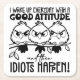 A humorous and sarcastic black-and-white graphic design showcases three bird silhouettes perched on a branch, each with big, expressive eyes. The black handwritten text reads, "I wake up every day with a good attitude and then idiots happen." This design is available on a variety of products, making it a perfect gift for bird lovers and fans of sarcastic humor.