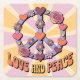 This coaster features a retro-style peace symbol illustration with a sunburst background pattern in yellow and lavender radiating lines. The peace symbol is indigo and filled with a circular wreath made of flowers and hearts. The wreath contains pink roses, orange roses, lavender daisies with yellow centers and red and pink and purple hearts arranged in a circular pattern. The text LOVE AND PEACE appears at the bottom in a bold font with a drop shadow, colored in orange and yellow. The coaster is a square paper pulp coaster. The coaster set contains six coasters.