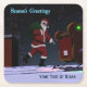 Santa Claus se ve en el tejado de una casa después de entregar regalos. Las luces rojas y verdes de navegación de su trineo se reflejan en la nieve de la azotea, y la placa personal de Santa Polo Norte es visible. El texto que dice "Saludos de temporada" también aparece junto con un lugar para tu propio texto.