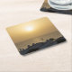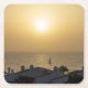 Vista del complejo de bungalows al mar con barco de vela al atardecer, en Costa Adeje, España, Tenerife