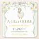 This charming sage green baby shower theme features a vintage-inspired goose wearing a bonnet, delicate daisy florals, soft stripes, and an elegant bow detail. The playful phrase “A Silly Goose is Almost on the Loose” makes it perfect for a gender neutral baby shower celebration.
