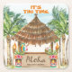 Los posavasos temáticos de la fiesta luau tropical presentan un bar Tiki en la playa con estilo de acuarela (con un loro y cócteles) enmarcado por palmeras, antorchas Tiki y tótems con leyendas "Aloha" y "It's Tiki Time" en fuentes de estilo isleño. Los nombres y la leyenda se pueden personalizar.