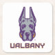 El logo de la mascota de la Universidad de Albany Great Dane muestra una elegante representación de la cabeza de un Gran Danés. El perro está ilustrado con líneas agudas y audaces en morado y gris, dándole una expresión feroz y segura de sí misma. Las orejas se sostienen alto, simbolizando la alerta y la fuerza. Debajo de la cabeza del Gran Danés está la palabra "UAlbany" escrita en letras de oro audaces y bloqueadas, delineadas en morado, reforzando la marca de la universidad. Este diseño representa a los equipos deportivos de la UAlbany, destacando el poder, la lealtad y la determinación.