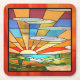 Conjunto de láminas desechables de cartón cuadrado con una imagen de un colorido vidrio de estilo Art Déco; paisaje de colinas onduladas, lago o océano, árboles y un sol naciente.Vea la montaña rusa y las servilletas de plástico a juego. Vea toda la colección de Montaña Roaring 20s en el FOOD/BEV| Sección de las cisternas.