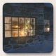 Mirando en las ventanas de la cabaña en una helada noche de invierno justo antes de los Navidades. Las velas rojas brillantes están encendidas, lo que envía un cálido resplandor sobre la nieve. El árbol de Navidad y el manto están decorados con púrpura y bolas de oro. Un gato calico mira por la ventana a una garganta sentada en el exterior del alféizar, y un par de zorros se asoma a la esquina de la casita.