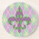 Un patrón de arlequín de verde y púrpura se transforma en un estilo lúdico con una superposición de contornos de diamante dorado y fleur de lis, creando un patrón divertido y colorido perfecto para cualquier celebración del Mardi Gras influenciada por Nueva Orleans. El patrón está enmascarado detrás de la silueta de un fleur de lis para añadir una divertida nota final.