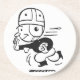 El dibujo animado blanco y negro de un futbolista que corre con la bola, distribuye, listo para bloquear. Él está llevando un casco de fútbol americano de cuero pasado de moda. Grande para los fiestas del fútbol