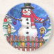 Original pintura acuarela de Sandra Gale de un hombre de nieve tradicional parado frente a una valla de piquete con brillantes luces de Navidades que reflejan la nieve del invierno. Aves, casas de pájaros y adornos navideños hacen de esto una escena clásica de Navidades que se ve genial en envolver papel, tarjetas de vacaciones y más!