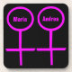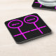 Este fantástico posavasos de corcho está diseñado para lesbianas. Cuenta con dos símbolos femeninos rosas uno al lado del otro. El fondo es negro y hay texto rosa personalizable dentro de cada uno de los símbolos para poner nombres.