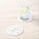 El conjunto consta de 6 estuches redondos, absorbentes, de cartón para bebidas para duchas de boda, recepciones de bodas e incluso cenas de ensayo con un diseño moderno, de color melocotón, un diseño sencillo de corona de corazón junto con los nombres de novios y novios y fecha de boda impresa en letras de color gris oscuro y estilizadas. Edite y reemplace los nombres y la fecha con los suyos.