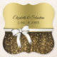 Estos hermosos posavasos añadirán un toque al ambiente de la recepción de tu boda. El diseño presenta una cinta blanca y un lazo que separa el foil dorado falso de una textura bokeh dorada brillante en la parte inferior. El texto incluye los nombres de la pareja y la fecha de la boda.