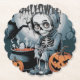 Escena espeluznante de Halloween con un esqueleto dentro de una calabaza, rodeada de elementos inquietantes.