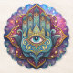 An artistic and detailed representation of the hand of Fatima, a powerful symbol of protection and good fortune, adorned with intricate designs and an all-seeing celestial eye.