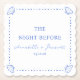 Bebe, brinda y celebra con estilo con estos posavasos chic para la cena de ensayo. Con un delicado borde de concha de vieira azul y tipografía clásica, añaden el toque personalizado perfecto para tu reunión de la noche anterior. Ya sea que organices una soirée junto al mar o una cena elegante, estos posavasos personalizados elevan cada sorbo.