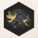 Colibríes con joyas negras y doradas sobre un fondo gris adornado con plantas. Aves de joyas. Ave dorada. Ave dorada.