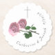 El diseño presenta la imagen de una cruz de plata que se muestra sobre dos rosas entrelazadas y rosas rosas. Los nombres de la novia y del novio, junto con la fecha del boda, están rodeados de la imagen en un elegante tipo de letra de color plateado. Diseñado para coordinar con "Love is in Bloom Boda Suite".